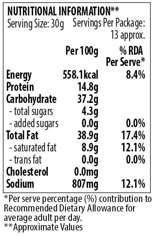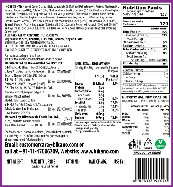Refined Palmolein Oil, Cashew Nuts (Kaju), Gram Flour (Besan), Lentils, Rice Flakes, Peanuts, Spices & Condiments, Salt, and Curry Leaves.