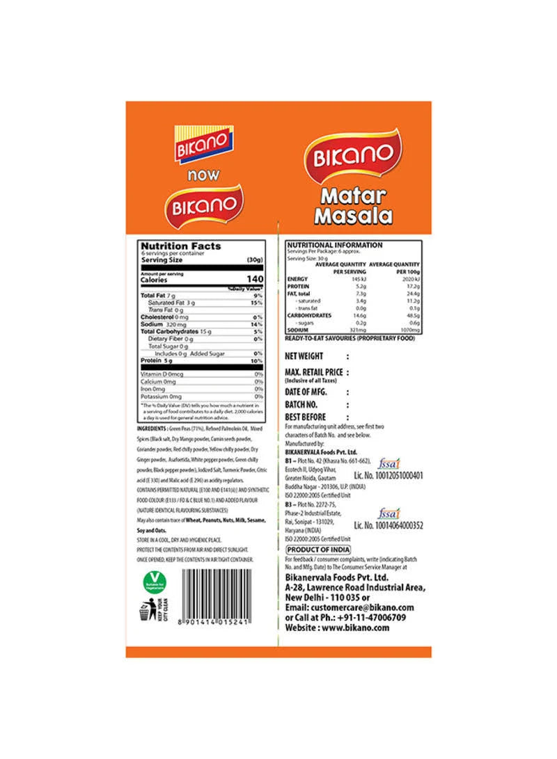 Bikano Matar Masala is a crunchy, spicy snack made from roasted green peas seasoned with aromatic Indian spices. It offers a perfect combination of taste and nutrition, delivering a flavorful burst of spice and crunch in every bite. Ideal for tea-time, parties, or on-the-go snacking, this protein-rich snack satisfies your cravings while keeping it light and tasty.