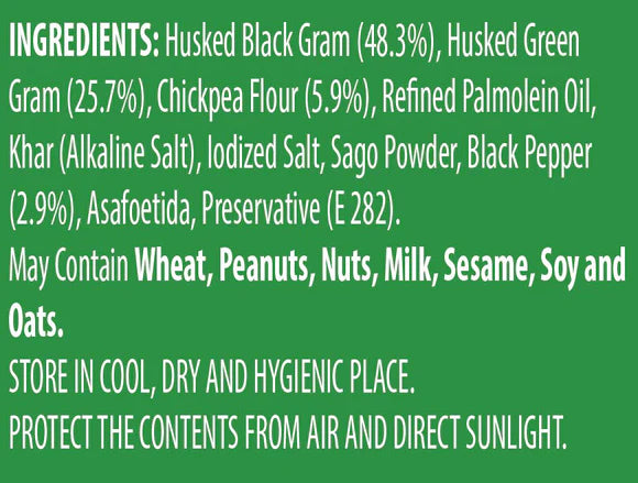 Husked Black Gram (Urad Dal), Chickpea Flour, Edible Vegetable Oil, Khar (alkaline salt), Black Pepper Powder, Asafoetida, Salt, and Permitted Condiments.