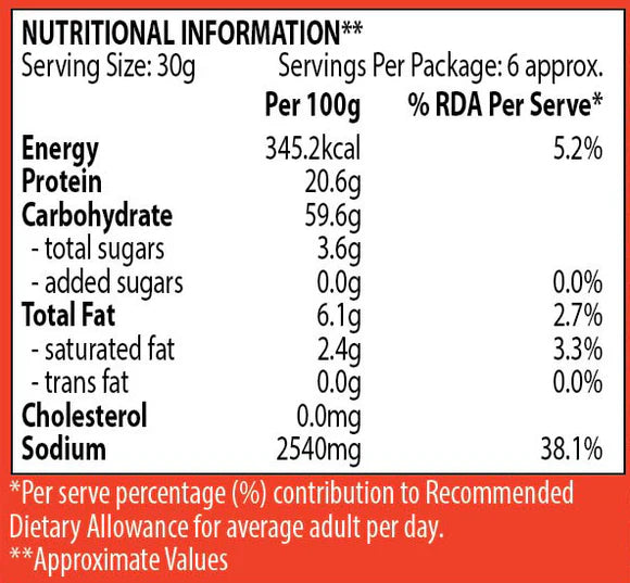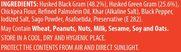 Husked Black Gram (Urad Dal), Chickpea Flour (Besan), Refined Oil, Khar (alkaline salt), Asafoetida (Hing), Cumin Seeds, Black Pepper Powder, Salt, and Permitted Spices & Condiments.