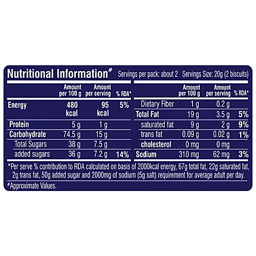Refined Wheat Flour (Maida), Sugar, Edible Vegetable Oil (Palm), Invert Syrup, Cocoa Solids (2.7 %), Maize Starch, Liquid Glucose, Raising Agents (INS 503(ii), INS 500(ii)), Iodised Salt, Milk Solids, Emulsifier (INS 322), Natural Colour (INS 150a, INS 150d), Nature Identical & Artificial Flavouring Substances (Vanilla, Milk, Chocolate)