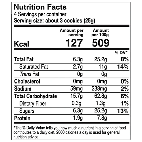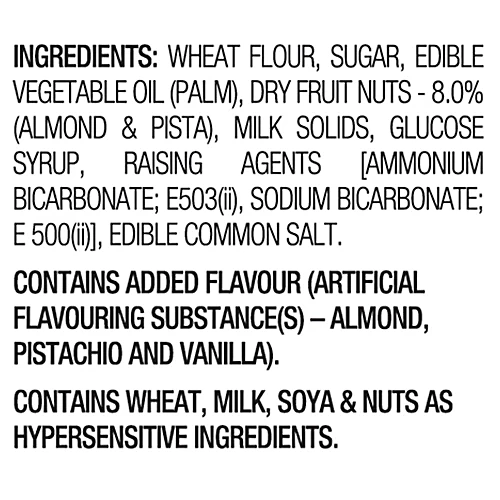 Refined Wheat Flour (Maida), Edible Vegetable Oil (Palm), Sugar, Dry Fruit Nuts – 8% (Almond & Pista), Milk Solids, Glucose Syrup, Raising Agents (Ammonium Bicarbonate E503(ii), Sodium Bicarbonate E500(ii)), Edible Common Salt, Permitted Emulsifier (Soy Lecithin E322). Contains added flavor (artificial flavoring substances) – Almond & Pista.