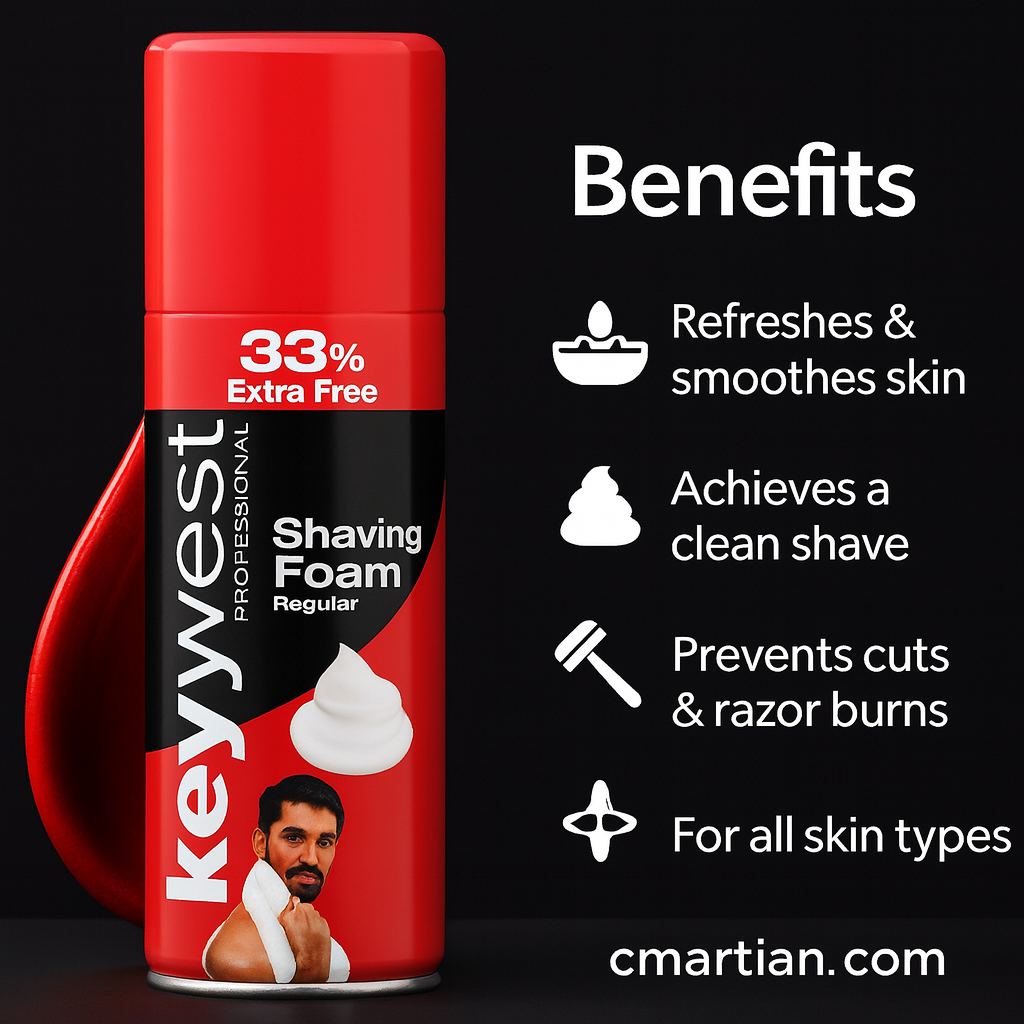 **Keywest Shaving Foam Regular** is designed to give you a smooth and refreshing shaving experience every time. Enriched with skin-soothing ingredients, it creates a rich foam that softens facial hair for a close and comfortable shave. It helps prevent cuts, nicks, and razor burns — leaving your skin smooth and refreshed.