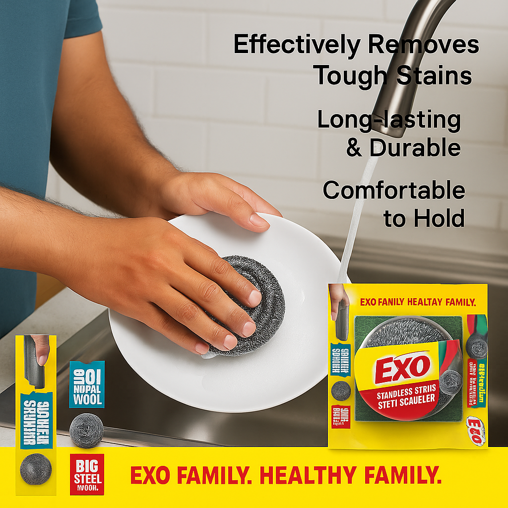 The Exo Scrub Pad with Steel Scrubber is a powerful kitchen cleaning combo designed to tackle tough grease, burnt stains, and everyday dishwashing needs. The steel scrubber effectively removes stubborn residues from cookware, while the antibacterial scrub pad ensures hygienic and efficient cleaning. Built with a super-thick design, it is durable and long-lasting, making it ideal for daily household use.