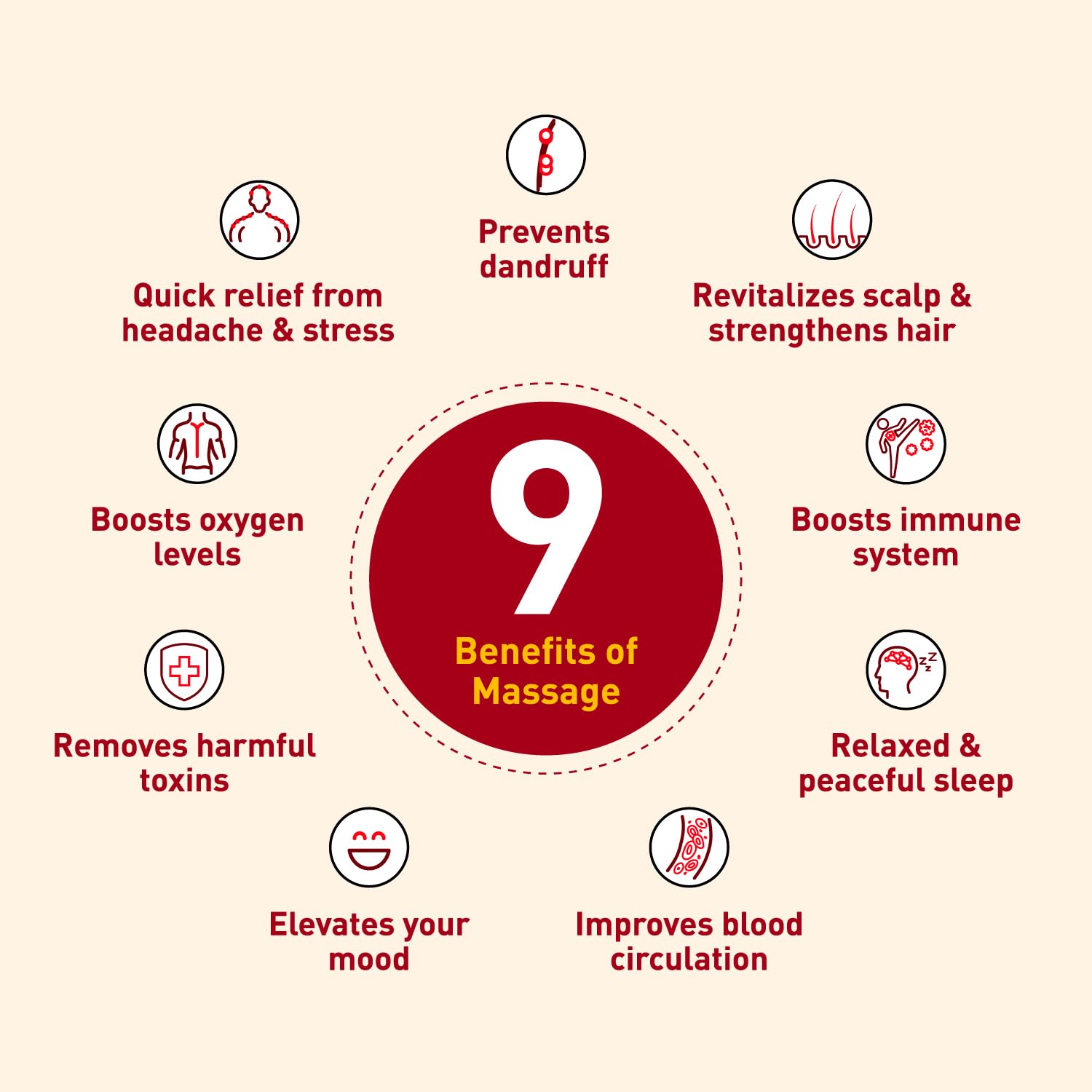 * It is marketed as a “cooling / refreshing hair & massage oil” that helps in relieving stress, tension, headaches, and gives relief from body ache.