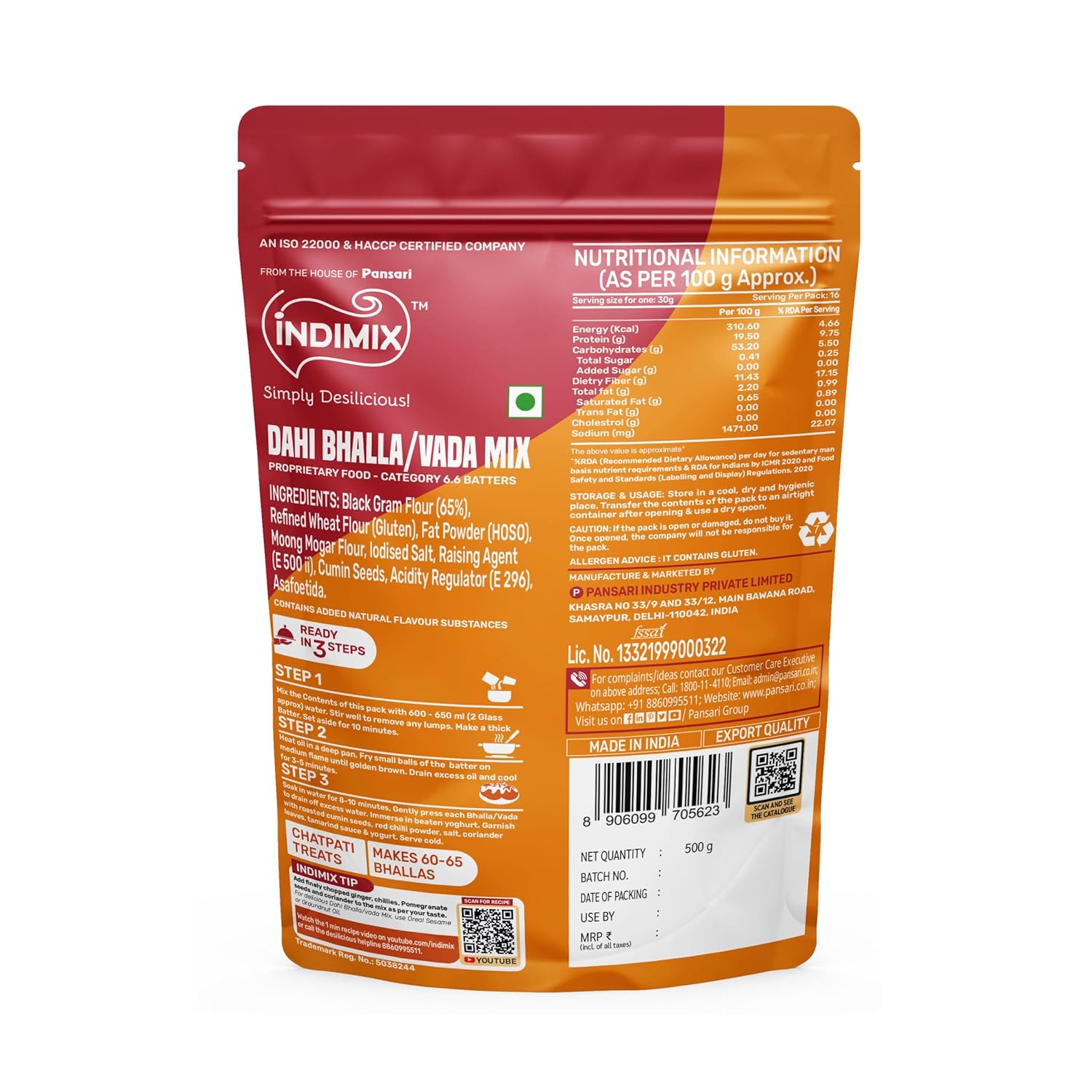 Indimix Dahi Bhalla Mix is a ready-to-cook mix that helps you prepare soft, spongy bhallas (lentil dumplings) to be soaked in yogurt and topped with chutneys and spices. The mix contains a blend of lentil flours, wheat flour, and traditional Indian spices, without added preservatives or coloring.