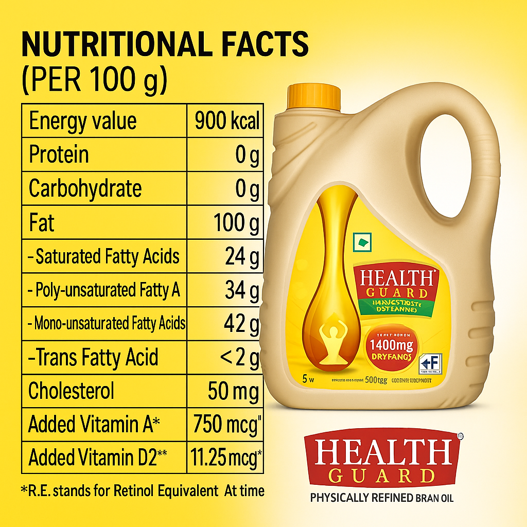 Experience healthier cooking with **Health Guard Physically Refined Rice Bran Oil**, enriched with the power of **14,000 PPM Oryzanol**. Specially formulated to support heart health, this oil is fortified with **Vitamin A** and **Vitamin D₂**, making it a smart choice for everyday cooking and frying.