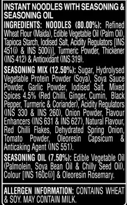 - **Seasoning Mix (12.5%)**: Sugar, Hydrolysed Vegetable Protein Powder (Soya), Soy Sauce Powder, Garlic Powder, Iodised Salt, Mixed Spices (4.5% — Red Chilli, Ginger, Cumin, Black Pepper, Turmeric & Coriander), Acidity Regulators (INS 330 & INS 260), Onion Powder, Flavour Enhancers (INS 631 & INS 627), Natural Flavour, Red Chilli Flakes, Dehydrated Spring Onion, Tomato Powder, Oleoresin Capsicum & Anticaking Agent (INS 551).